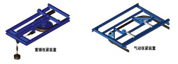 張緊裝置結(jié)構(gòu)采用重錘或氣動張緊,光輪或滾子列回轉(zhuǎn),張緊工作行程可達(dá)700毫米,可保證鏈條初張力不變,工作可靠,可滿足輸送機(jī)在任何工作環(huán)境下安全工作