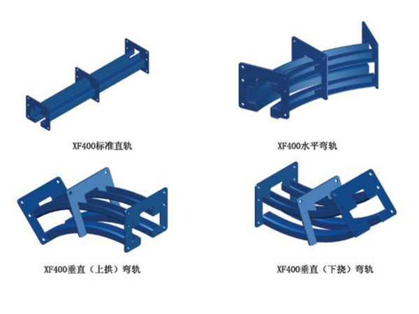 XF400型輸送機(jī)軌道包括標(biāo)準(zhǔn)直軌、水平彎軌、垂直彎軌、檢查軌、熱伸縮軌等。軌道由優(yōu)質(zhì)鋼板壓制成型,標(biāo)準(zhǔn)軌道長度6000,軌道兩邊裝有安裝括架,軌道中間每600裝有定位括架,軌道連接可以用螺栓連接,也可以將兩端的括架焊接連接。